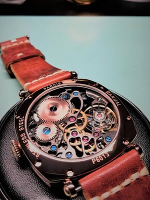 Das Uhrwerk ETA 6498.1 Handaufzug wurde aufwendig handskelettiert. Die Kanten sind ebenfalls handangliert. Werkplatinen sind mit Kreiselschliff versehen; die Innenseiten mit Perlageschliff. Die Platinen sind vergoldet und schwarz rhodiniert. Federgehäuse, Sperrrad und Aufzugsrad sind rosè vergoldet. Werksschrauben wurden thermisch gebläut. Das handgearbeitete Zifferblatt ist mit blauer transparenter Pigmentfarbe beschichtet, Zeiger in rosè vergoldet. Gefasst in einem 44mm Gehäuse in Kissenform, kommt das Uhrwerk mit Panoramaglasboden besonders schön zur Geltung.