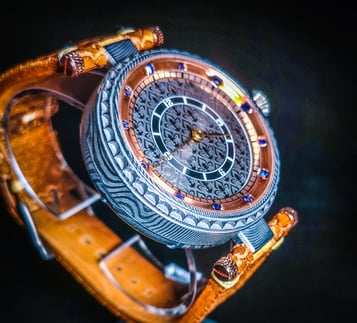 Ein schönes Omega Taschenuhrwerk von 1930 neu restauriert, Gehäuse Einzelanfertigung aus 300 Lagen geschmiedeter Edelstahl Damast., handgearbeitetes Zifferblatt mit Lilien Muster Profil, schwarz rhodiniert, handgearbeitetes Innenlünette rose vergoldet mit 12 blauen geschliffenen Saphiren. Beidseitig Saphirglas.