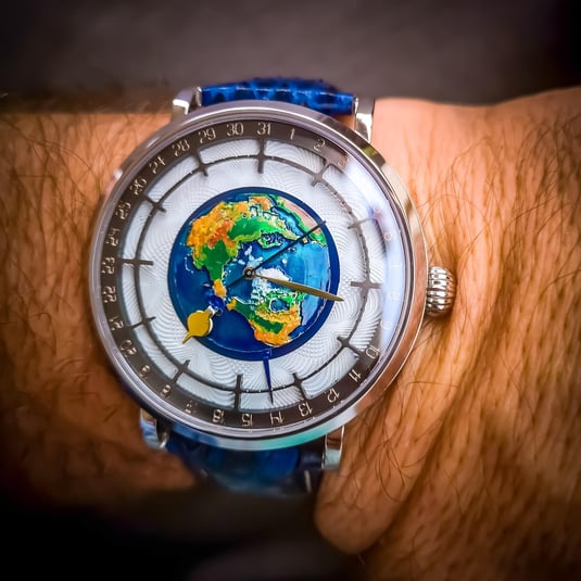 Die Weltuhr werden wir noch einmal mit etwas anderen Farbdesign herstellen. Die Idee mit dem dezentralen Datumszeiger sollte es unbedingt noch in den Shop schaffen.
