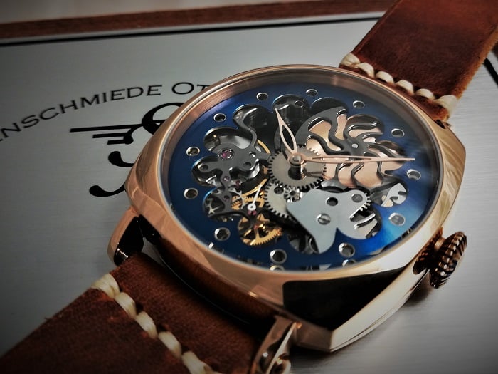 Ohne Vorlage habe ich mich an die Skelettierung des Uhrwerks (ETA 6498.1 Handaufzug) gewagt und ein beachtliches Design zustande gebracht. Das Uhrwerk in dieser Form gibt es garantiert kein zweites Mal und wird auch so nicht mehr hergestellt. Also ein garantiertes Unikat aus unserem Hause! Mein absolutes Lieblingsstück, welches ich mit Freude und Stolz ein paar Tage Probetragen werde