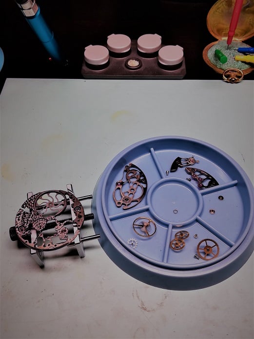 Ob Trend oder nicht; eine Skelettuhr ist immer wieder ein Meisterwerk von uns Uhrmachern. Genauigkeit beim Aussägen oder-fräsen sind gefragt. Die Kanten werden handangliert; Ausdauer ist nötig!
