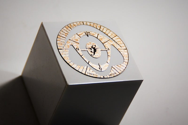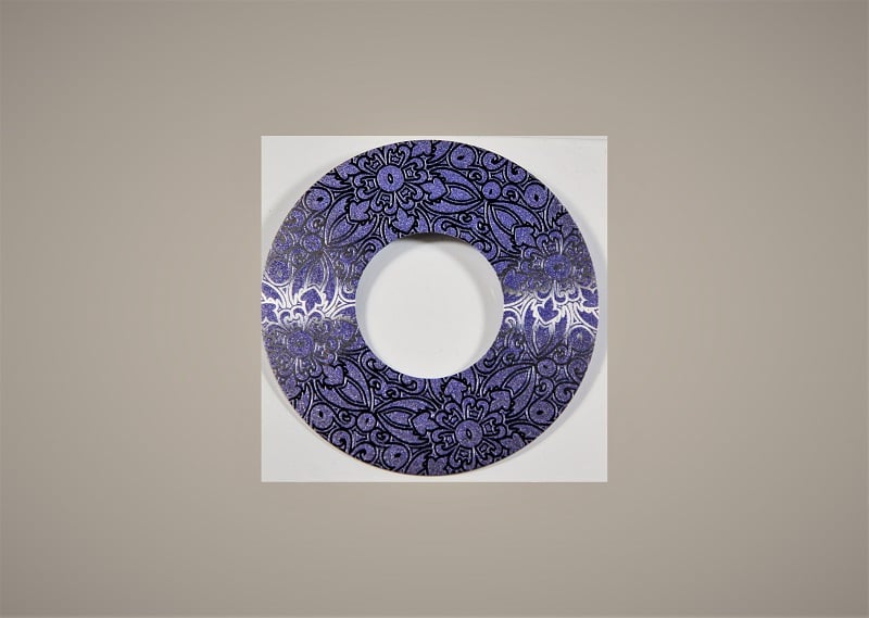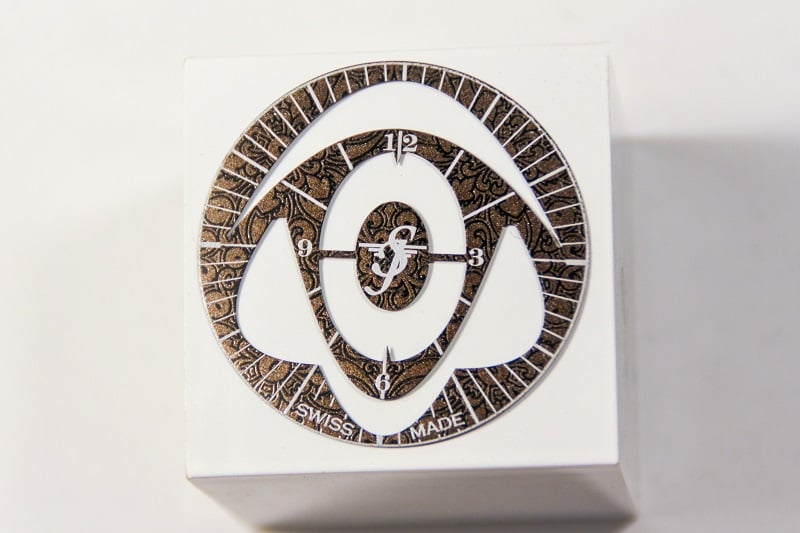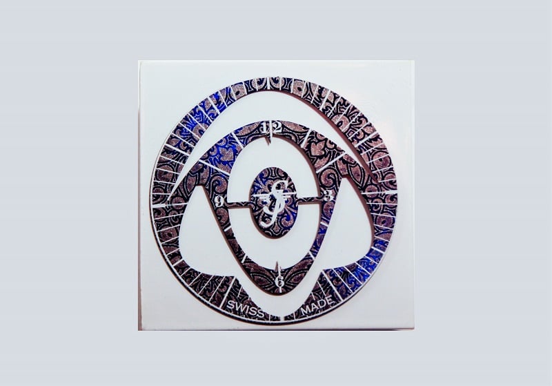 Das obere Zifferblatt und das untere Deckblatt sind versilbert und mit einer kreisförmigen Maserung versehen. Anschließend beschichten wir sie mit einer blauen, halbtransparenten Pigmentfarbe. Je nach Licht und Lichtwärme reflektiert die tiefblaue Pigmentfarbe zwischen dem Mandaladruck.