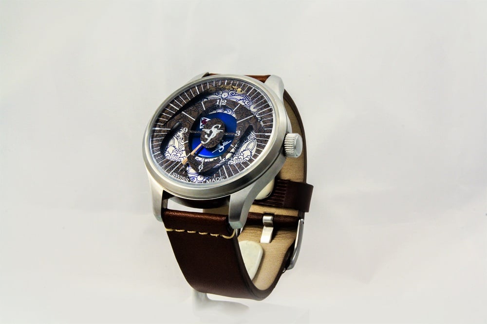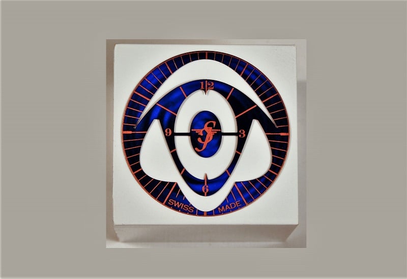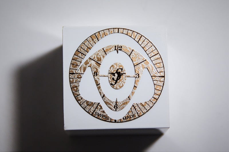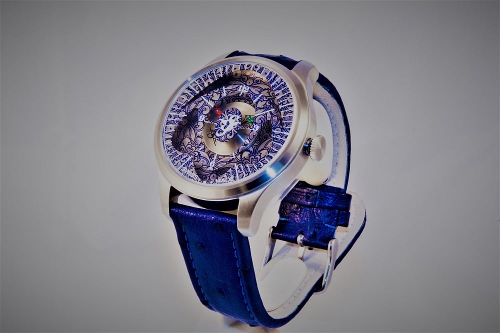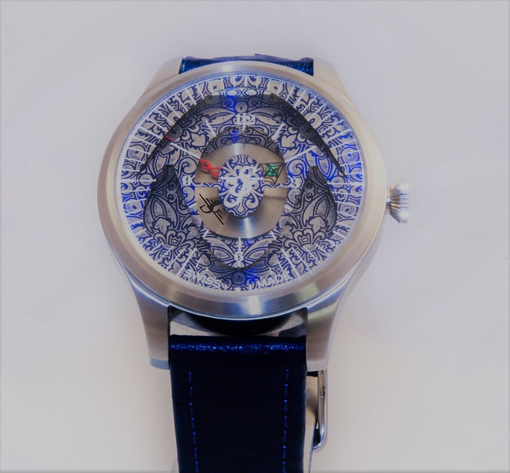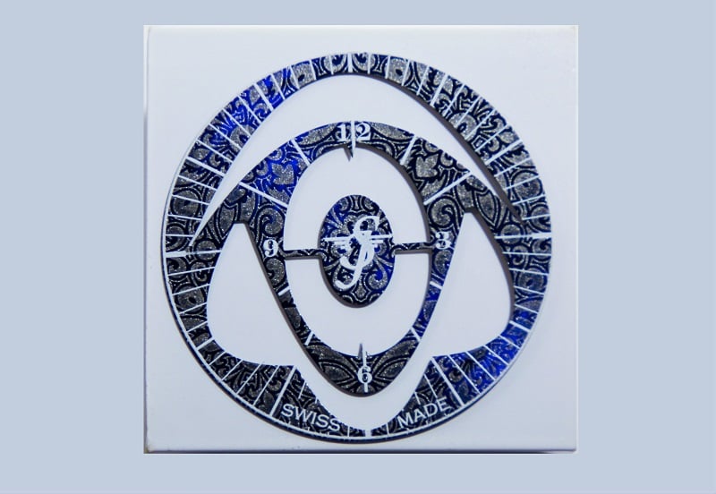 Bei diesem Druckdesign ist die Ansicht der Uhr eine Einheit beider Zifferblätter. Die Linien der Muster auf dem Deckblatt und dem oberen Zifferblatt sind genau gleich, sodass das Mandala in den ausgeschnittenen Bereichen des unteren Zifferblatts fortgesetzt wird.
