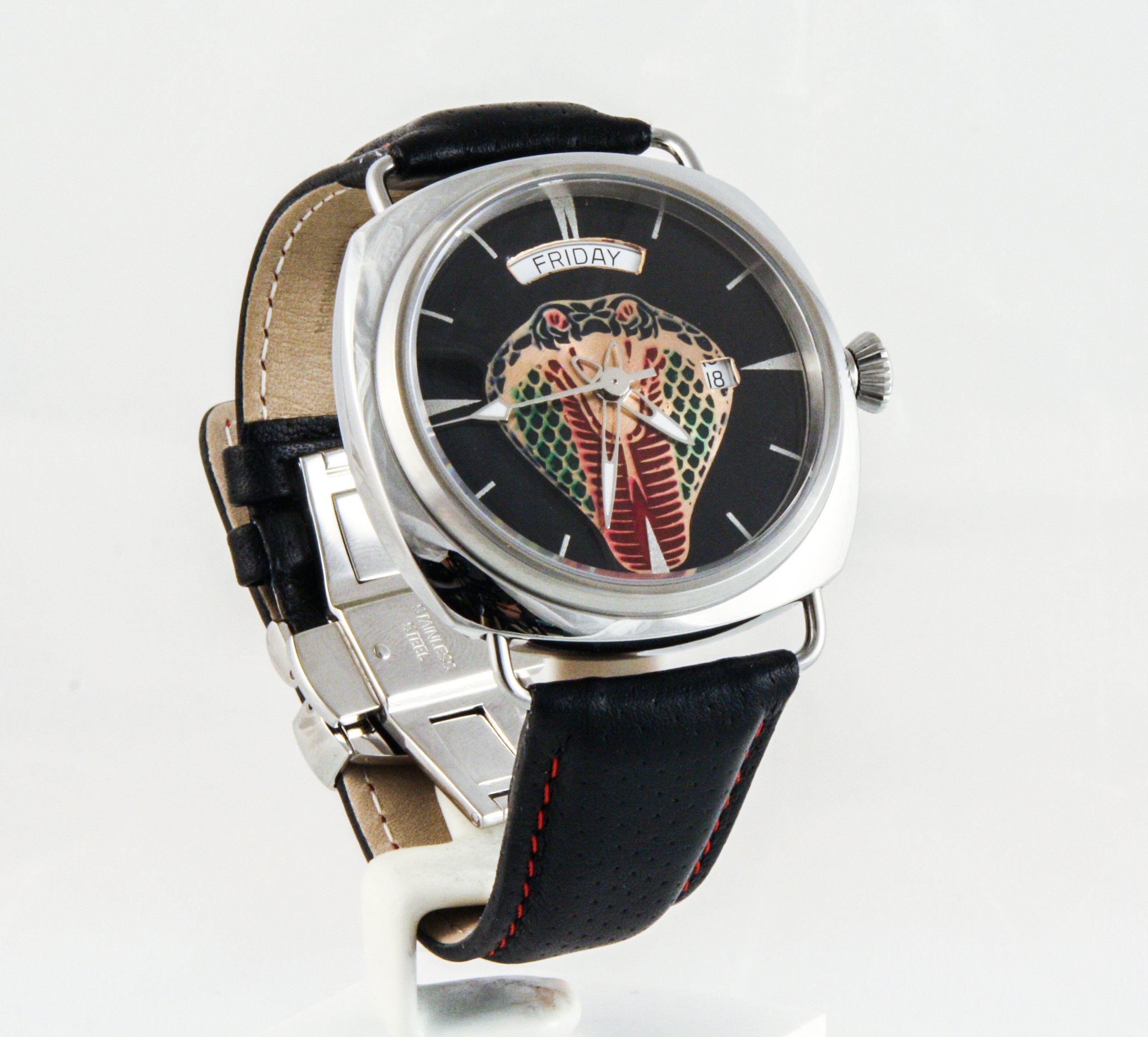 Auch bei dieser Uhr haben wir das Cobramotiv mit Ätztechnik auch dem Metall heraus gelöst. Das Zifferblatt wurde anschließend geschliffen und vergoldet. Die Farben wurden von Hand aufgetragen und als Abschluss bekam das Zifferblatt eine Glanzoberfläche mit Kaltemaile. Das Uhrwerk ist ein Schweizer Automatikwerk mit Tag-Datumsanzeige.