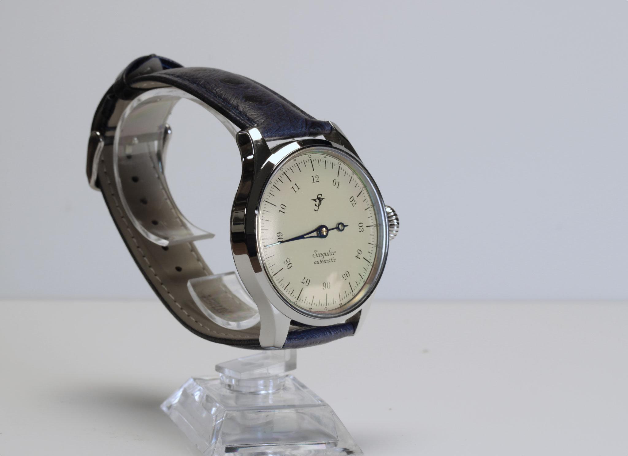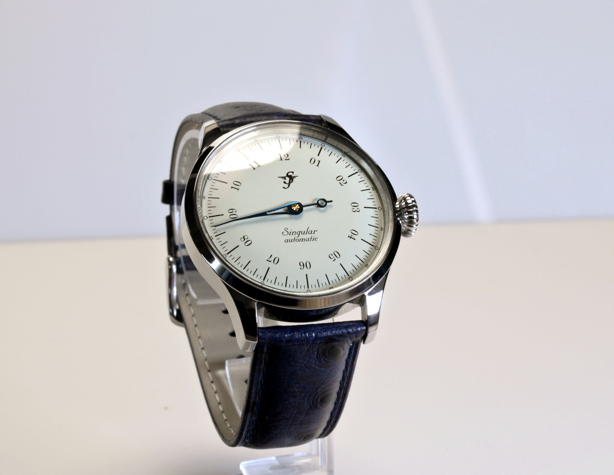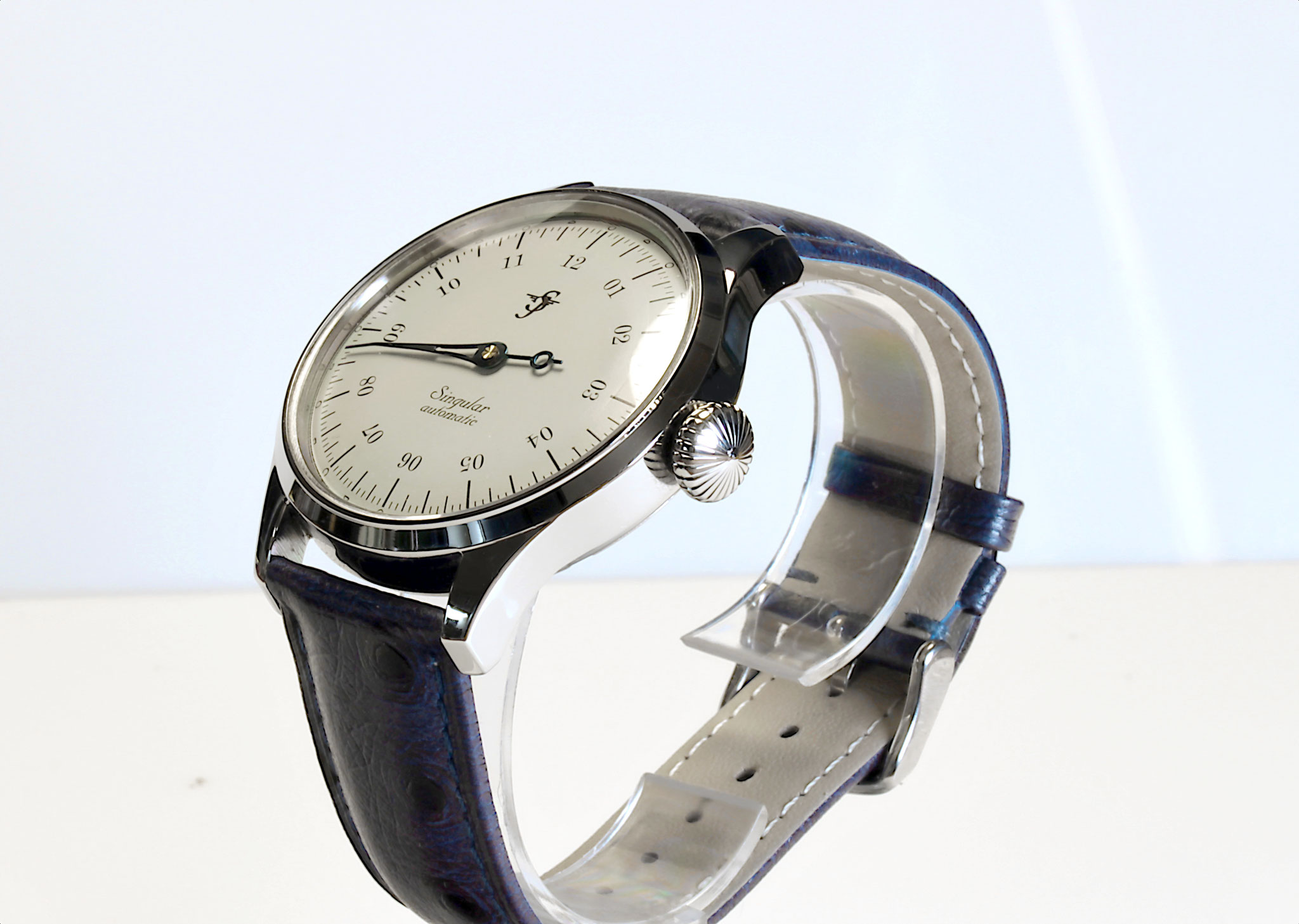 Einzeigeruhren sind unsere Spezialität. Für diese Uhr wurde ein gewölbtes Zifferblatt hergestellt und ein bombiertes Saphirglas verwendet. Der Zeiger, ebenso wie Zifferblatt, eine Einzelanfertigung, passt sich mit seiner Form an das Zifferblatt an. Er wurde nach der Handpolitur thermisch gebläut und hat in der Zeigerbohrung eine goldene Applique eingesetzt bekommen.