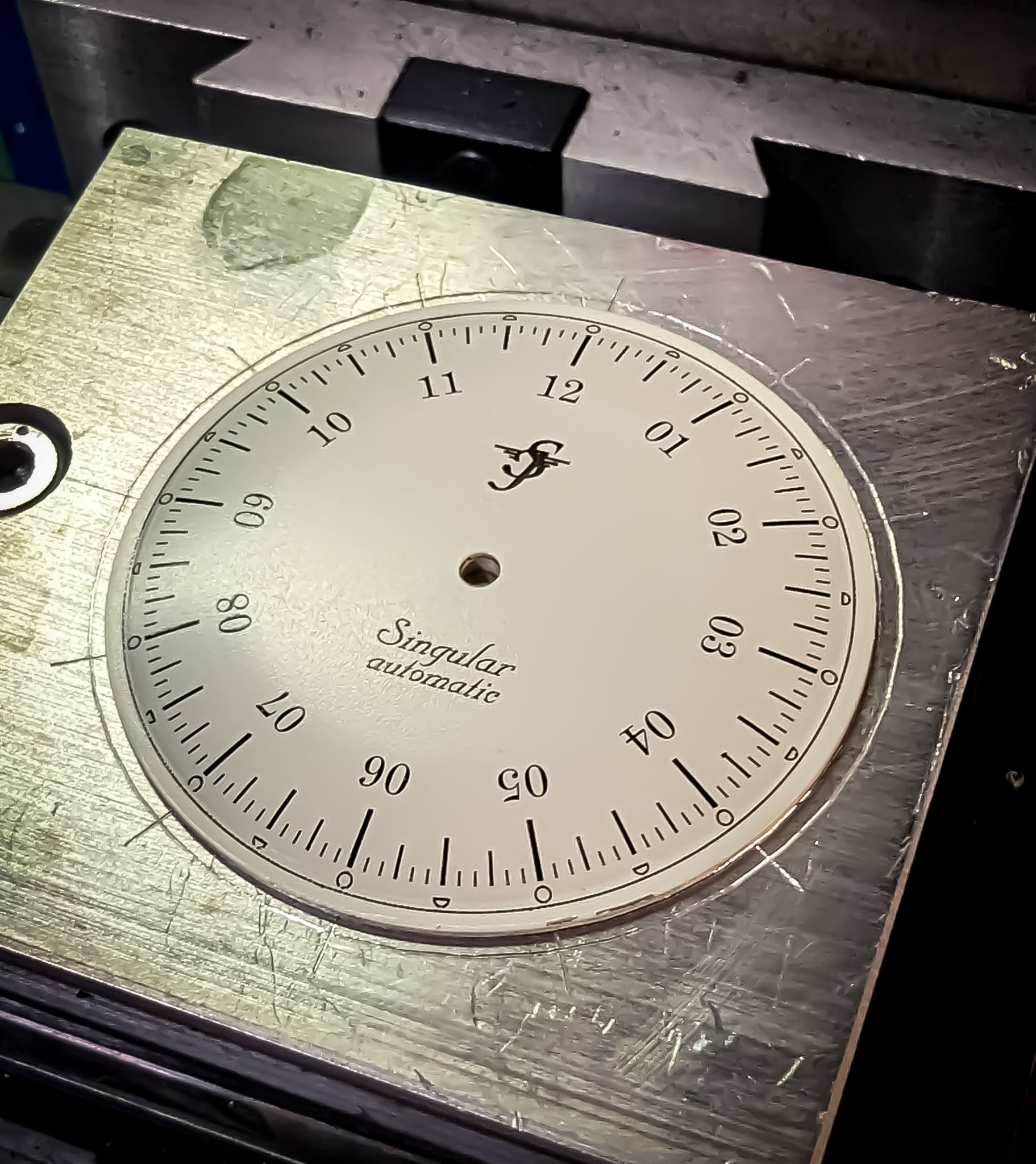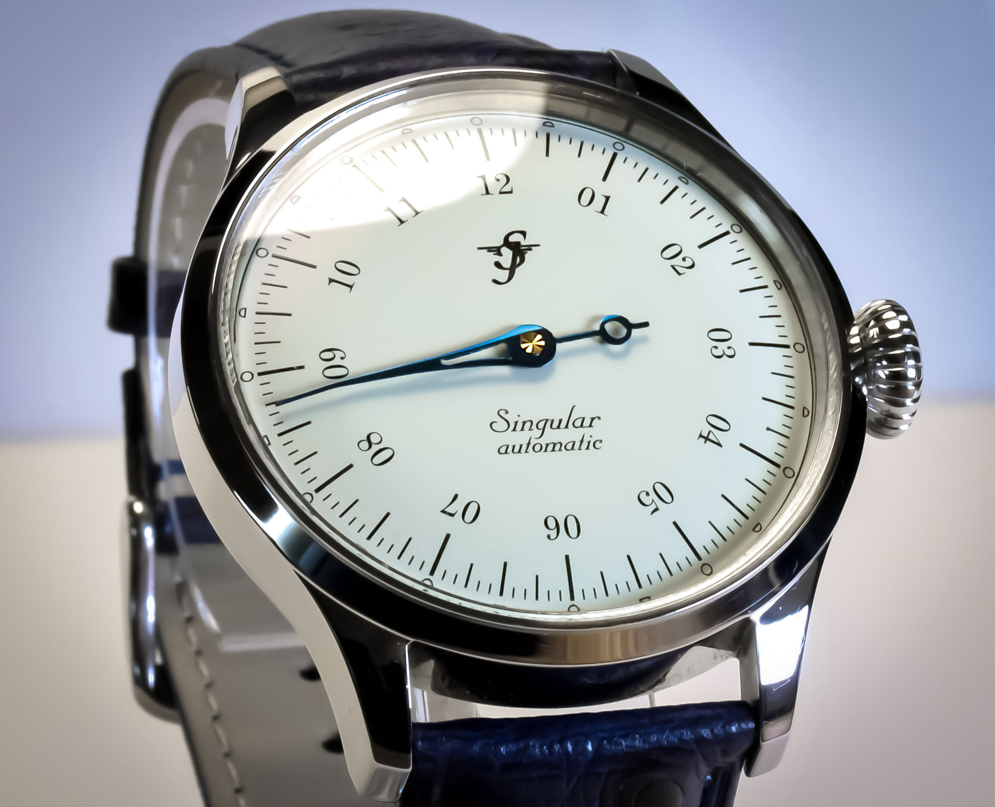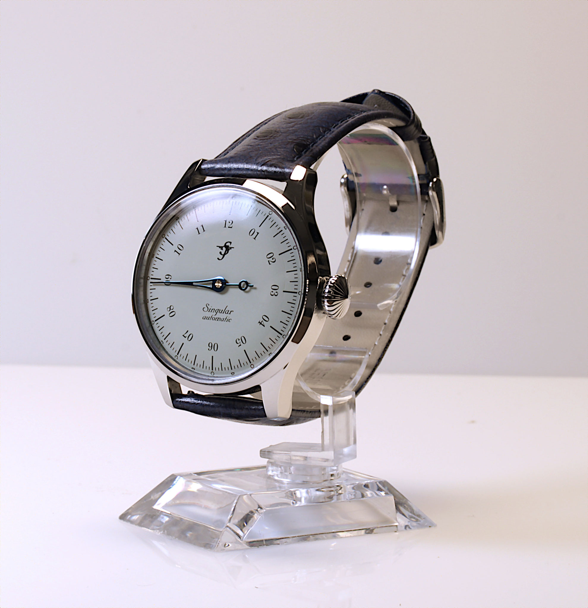 Einzeigeruhren sind unsere Spezialität. Für diese Uhr wurde ein gewölbtes Zifferblatt hergestellt und ein bombiertes Saphirglas verwendet. Der Zeiger, ebenso wie Zifferblatt, eine Einzelanfertigung, passt sich mit seiner Form an das Zifferblatt an. Er wurde nach der Handpolitur thermisch gebläut und hat in der Zeigerbohrung eine goldene Applique eingesetzt bekommen.