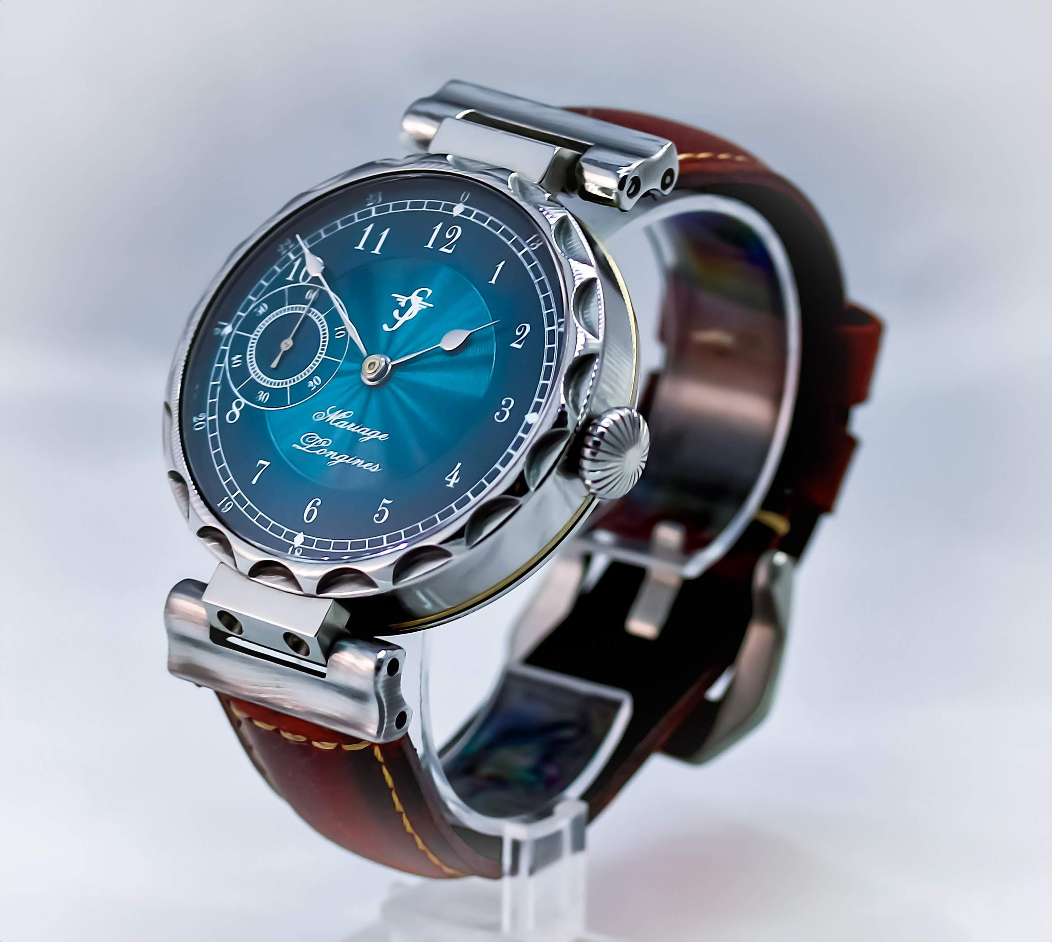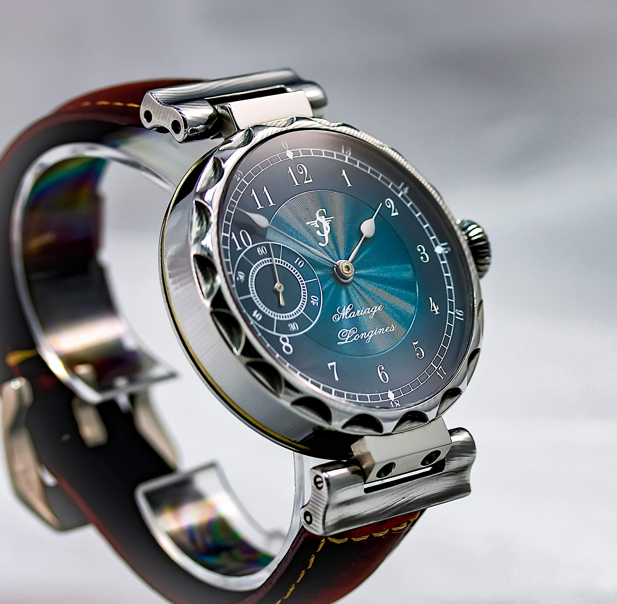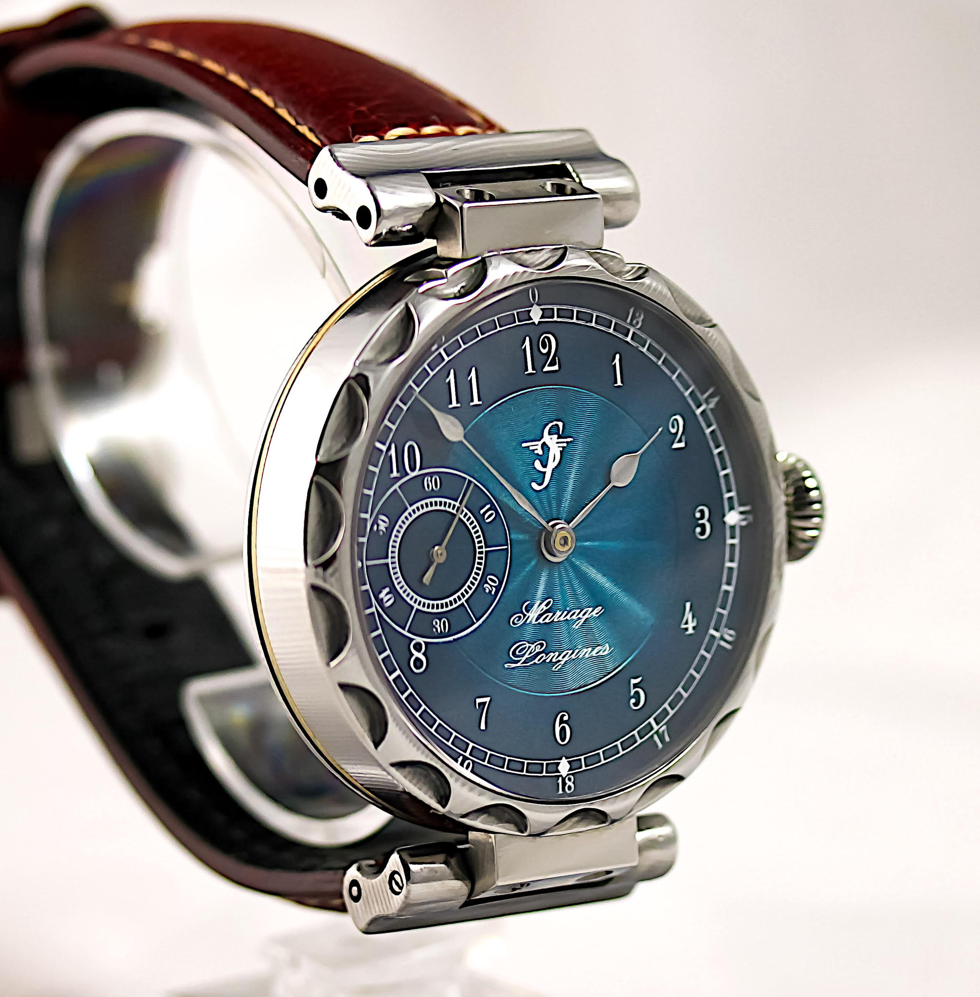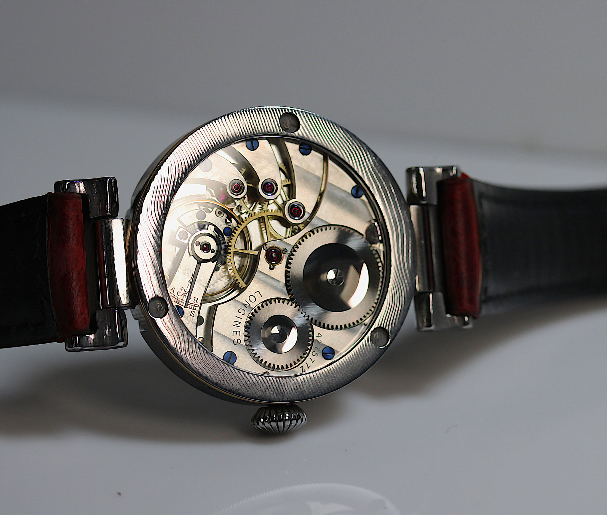Das Gehäuse aus Edel-Damaststahl. Der Rohling handgeschmiedet auf 300 Lagen. Extra für dieses schöne Longines Werk Auf Dreh- und Fräsmaschine hergestellt. Bewegliche Bandanstösse. Beidseitig Saphirglas. Original Zifferblatt wurde neu beschichtet und bedruckt.